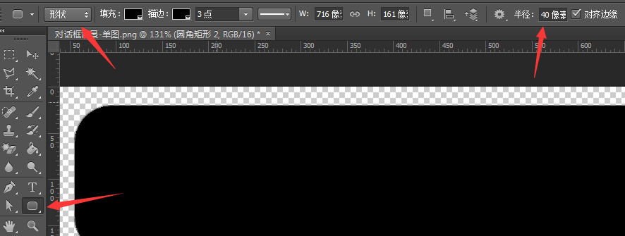选择ps中的形状工具,切换到圆角矩形,设置半径40像素。
