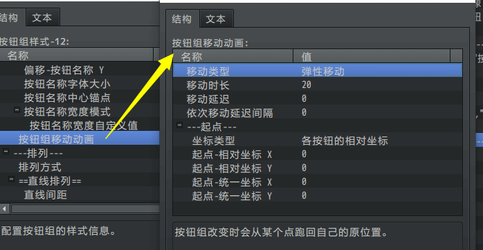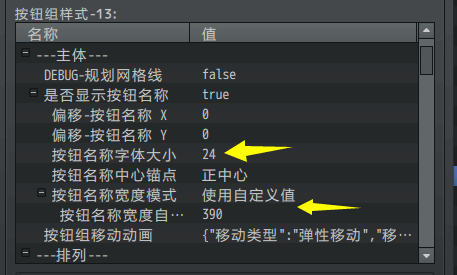 在按钮组核心中,配置 排列方式、按钮名称模式、指针、动画效果 等。