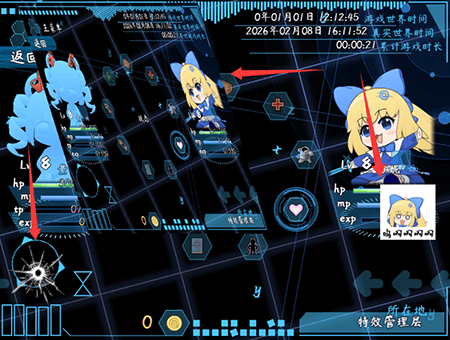 天窗层的装饰如下图。包含:斜切的动态快照、GIF实现的表情包、魔法圈实现的弹痕。装饰能跨 地图+战斗+菜单 界面。![]() ![]() |