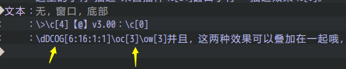 注意“\dDCOG[reset]”与“\dDCOG[off]”的区别,由于插件默认为所有文本都不发光,所以两者的效果是一样的。但如果你的游戏一开始就开启了发白光,那么“\dDCOG[reset]”是恢复一开始的白光,而“\dDCOG[off]”是关闭发光。