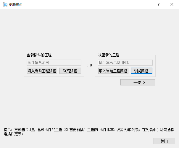 注意填写“含新插件的工程”和“被更新的工程”。
