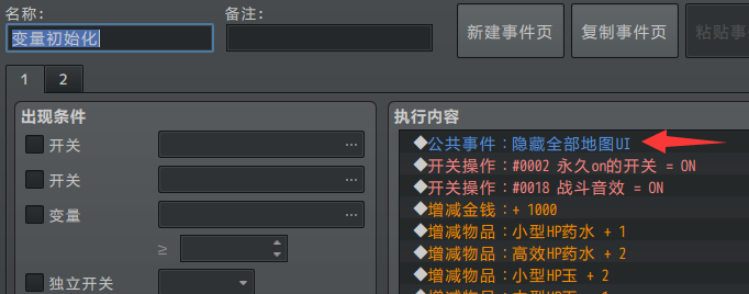这里需要从脚本层面上解析,因为公共事件和一般的hp增减功能不一样: