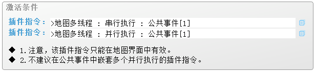 | 注意,串行和并行是对于 事件页 而言的,事件页与事件页之间可以并行或串行。事件页自身中的所有指令,都必须从上往下按顺序依次执行。另外,对话框事件指令是特殊的指令体,只要执行对话框,就会强制串行,阻塞其他所有事件的线程,这里的 并行串行 不包含该指令体造成的影响。 |